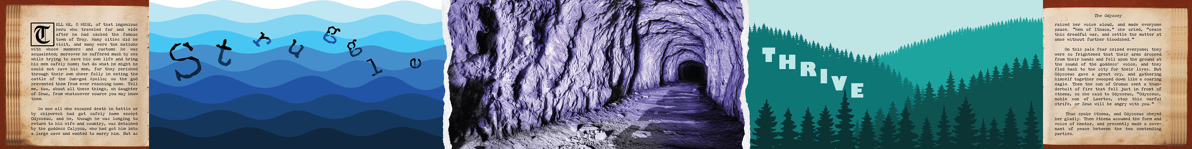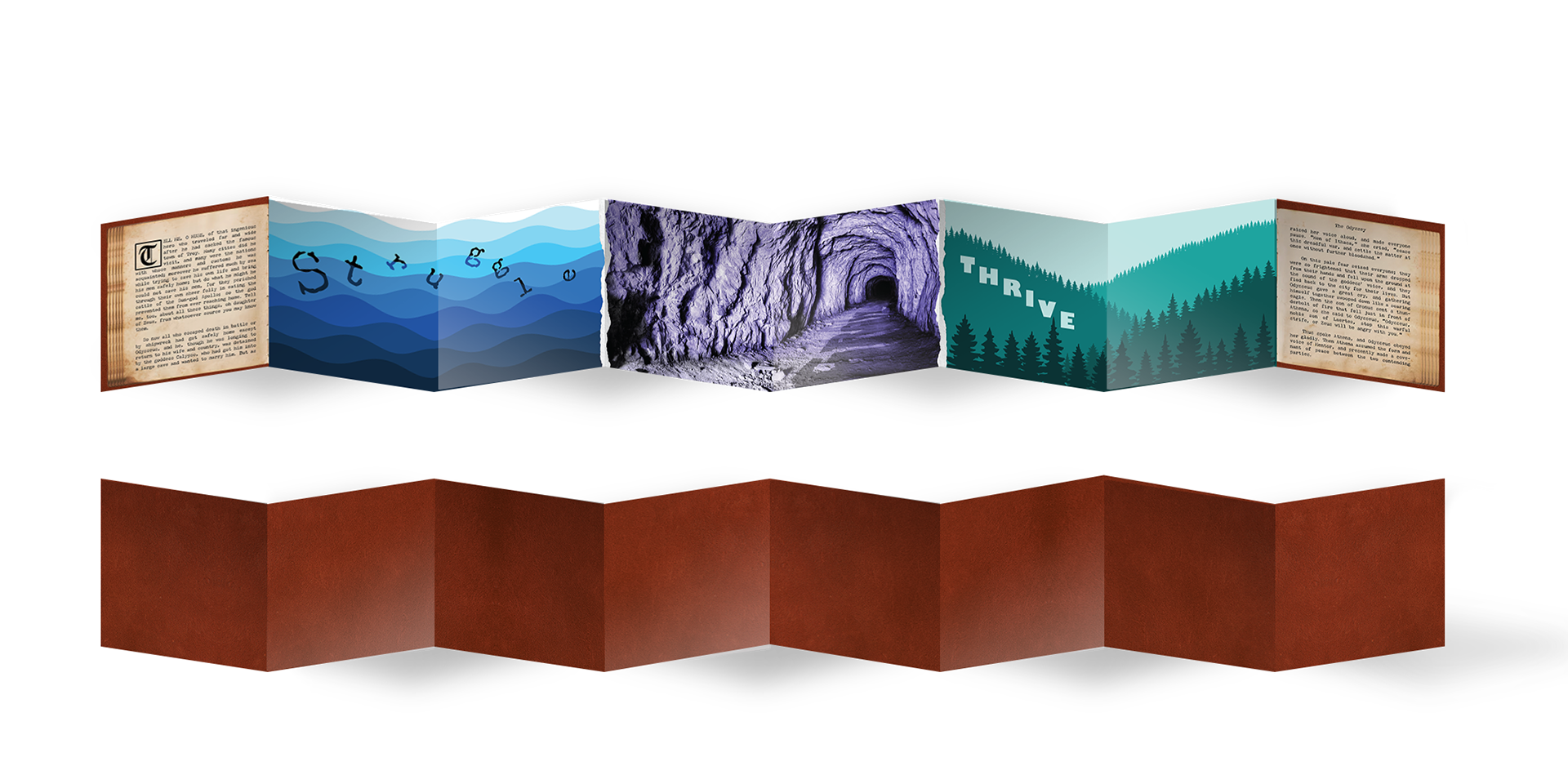 In this orihon-style booklet, I explored the physicality of folded storytelling, creating a cyclical design that begins and ends in the same place but transforms as it unfolds. Each pair of panels acts like a doorway into a shifting narrative, allowing the meaning to change with every reveal. Through this process, I learned to distill broad themes into a single unifying idea and translate that clarity into visual form.