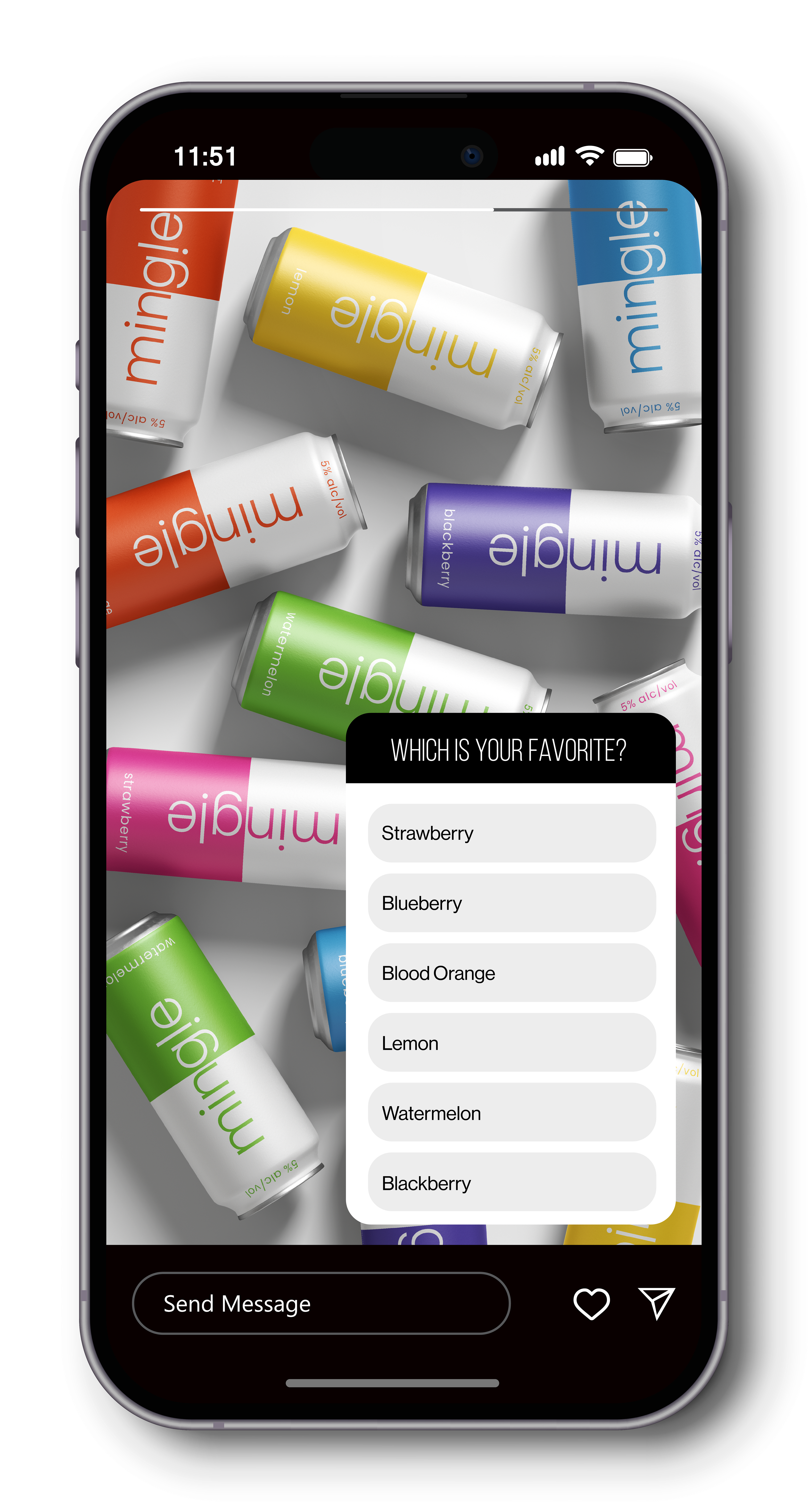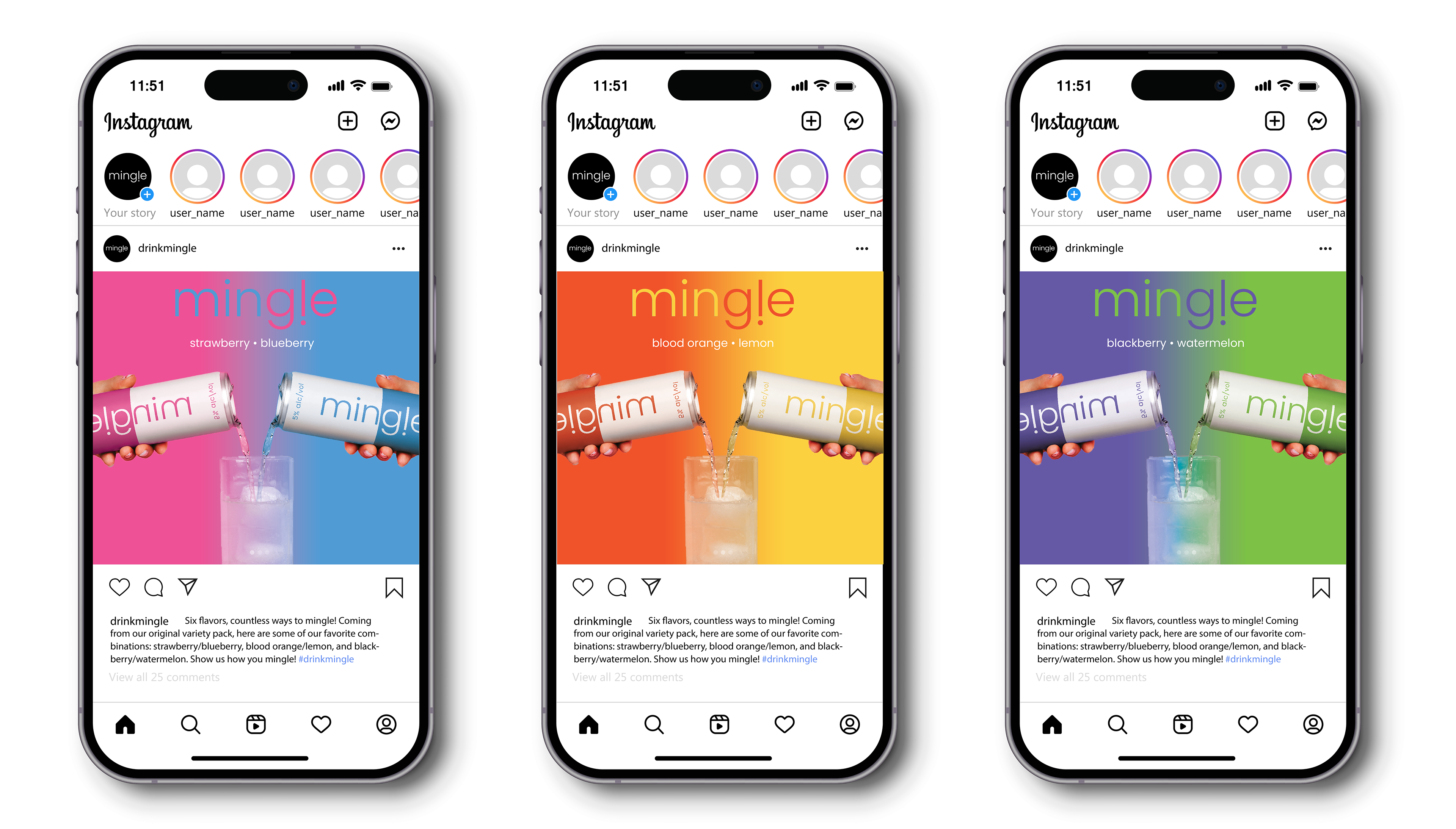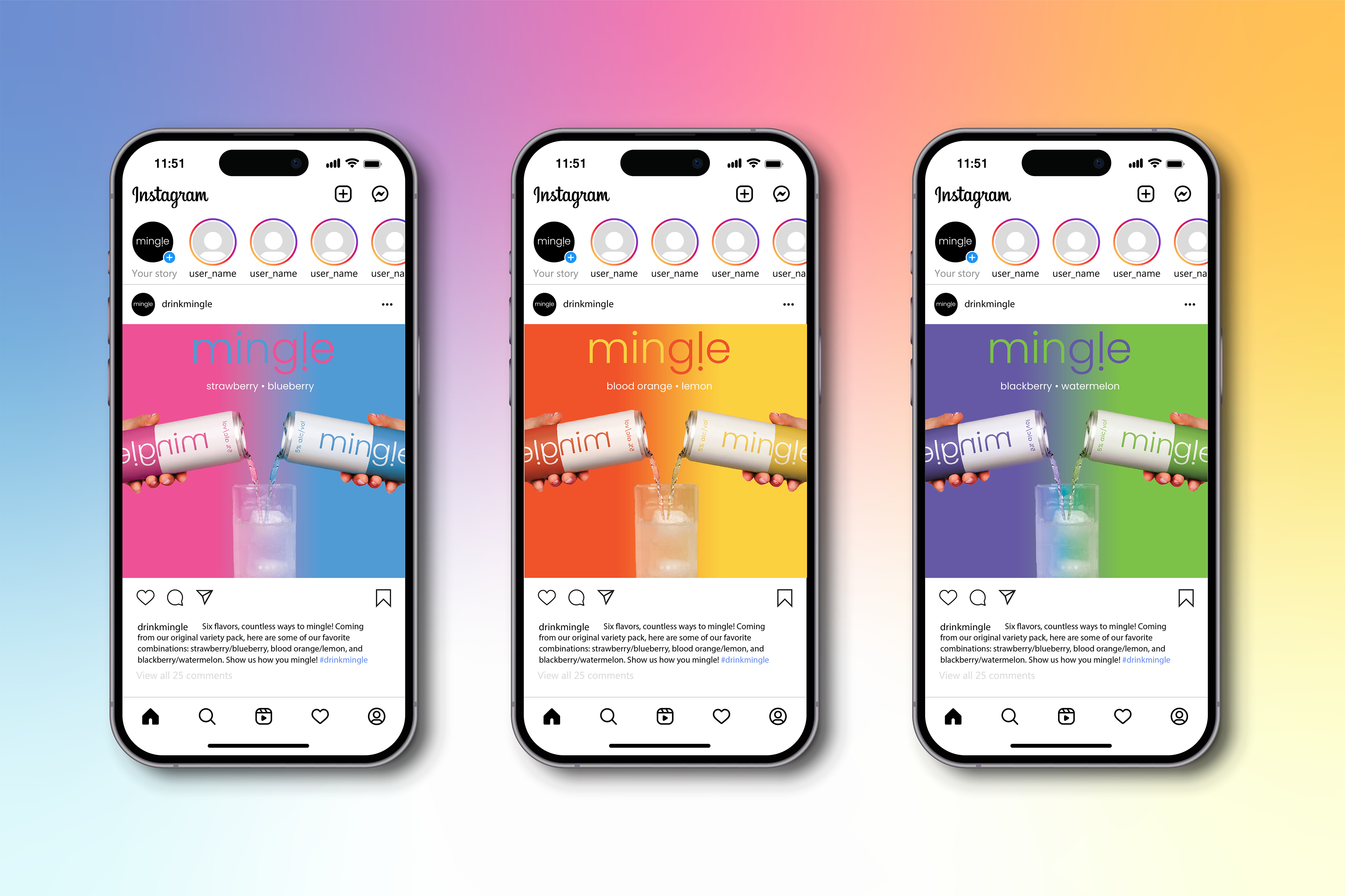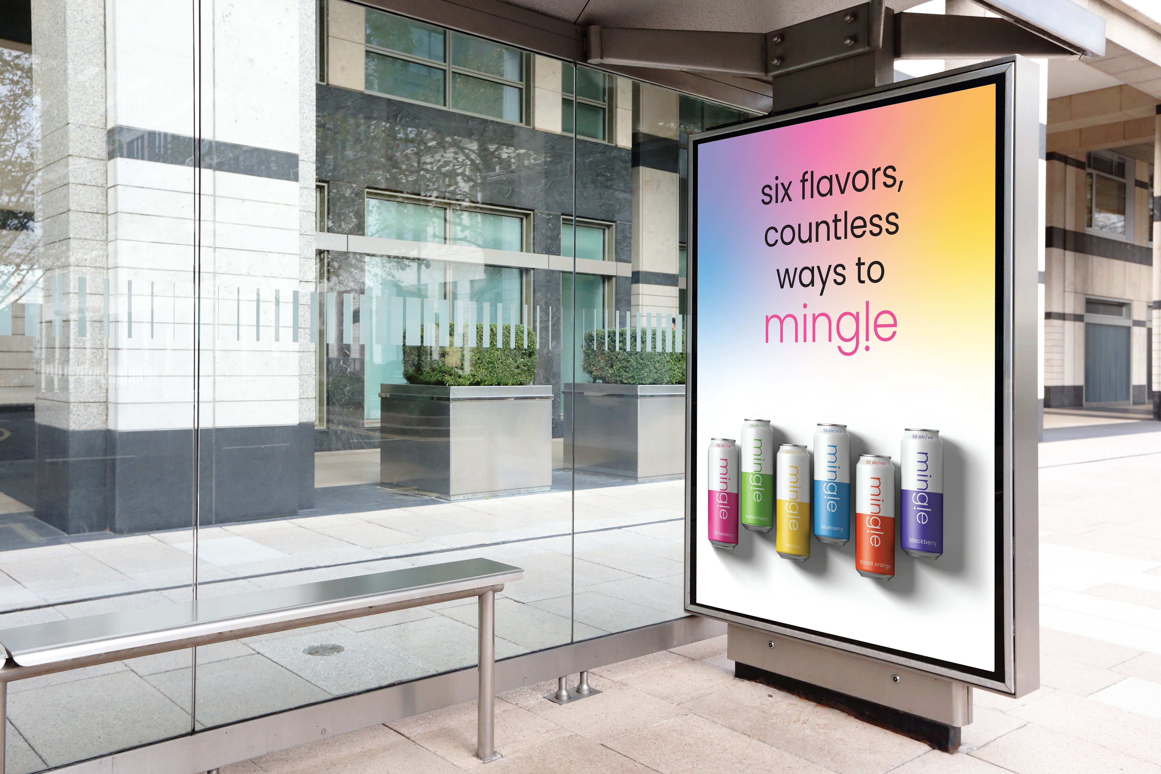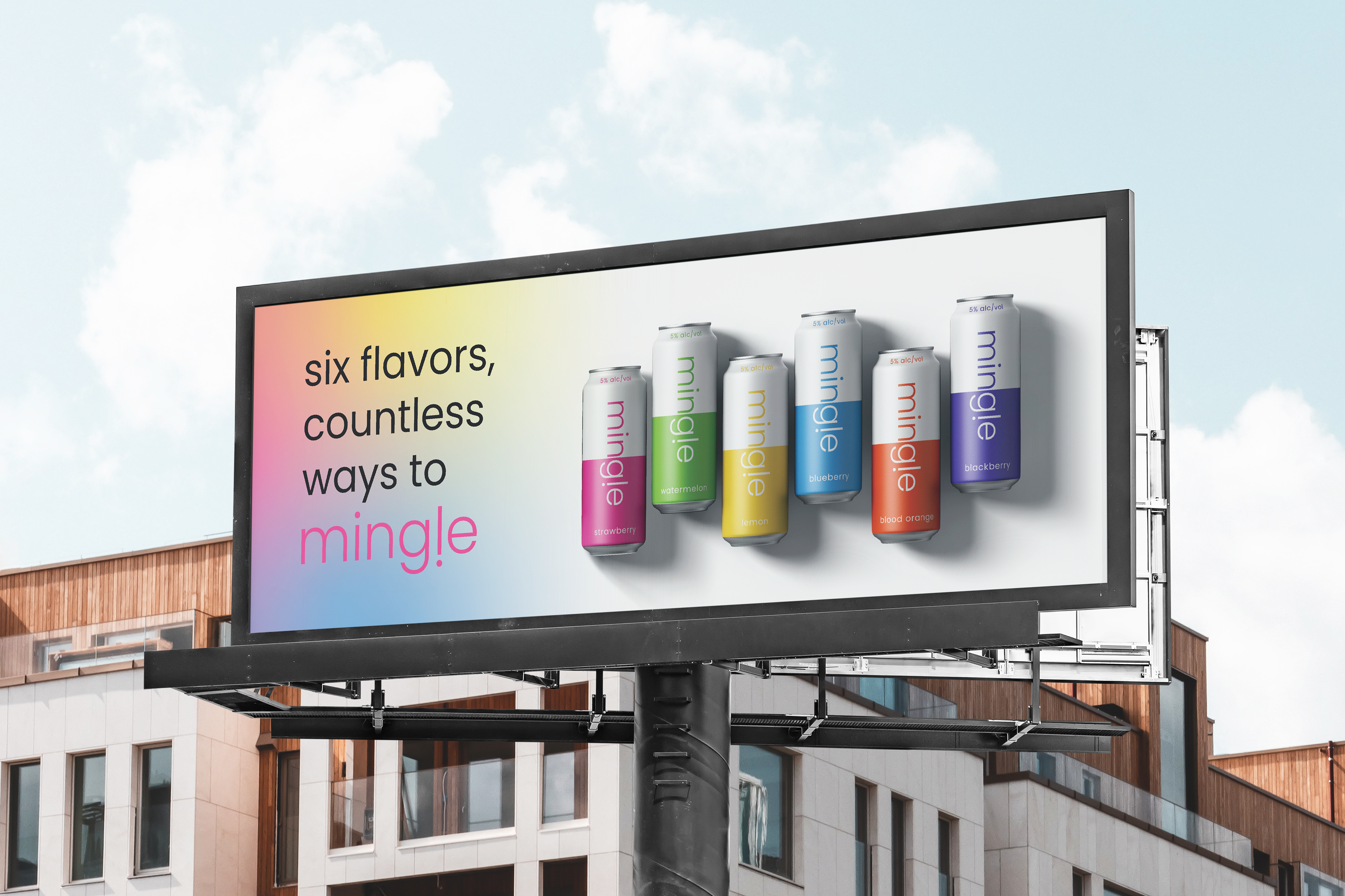 This group advertising project, created for an Intro to Advertising course at San José State University, focused on developing a fictional brand and full ad campaign for “Mingle,” a mixable canned cocktail aimed at young adults. Working within a cross-disciplinary team, I led the visual execution by designing campaign assets—including billboards, social media posts, and product mockups—using bold color systems and gradients to highlight the brand’s mix-and-match concept. The final campaign delivers a cohesive and playful identity across multiple formats, emphasizing both social interaction and product versatility.